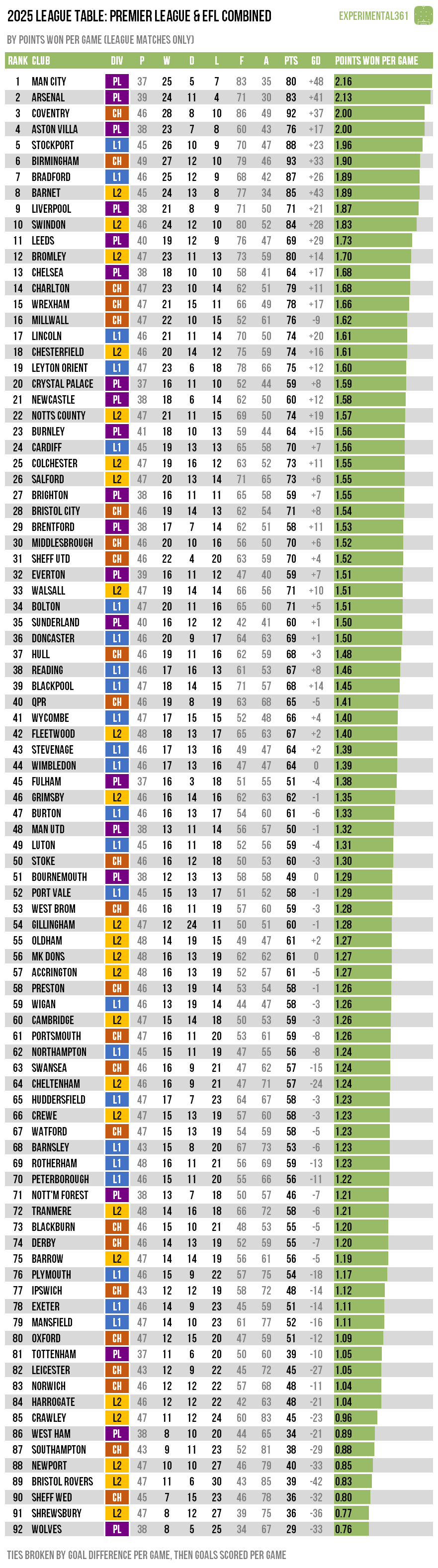 With the final league games of 2025 now completed, it's time for one of the least complex Experimental 361 traditions: a combined calendar year table for the 92 current Premier League and EFL clubs.