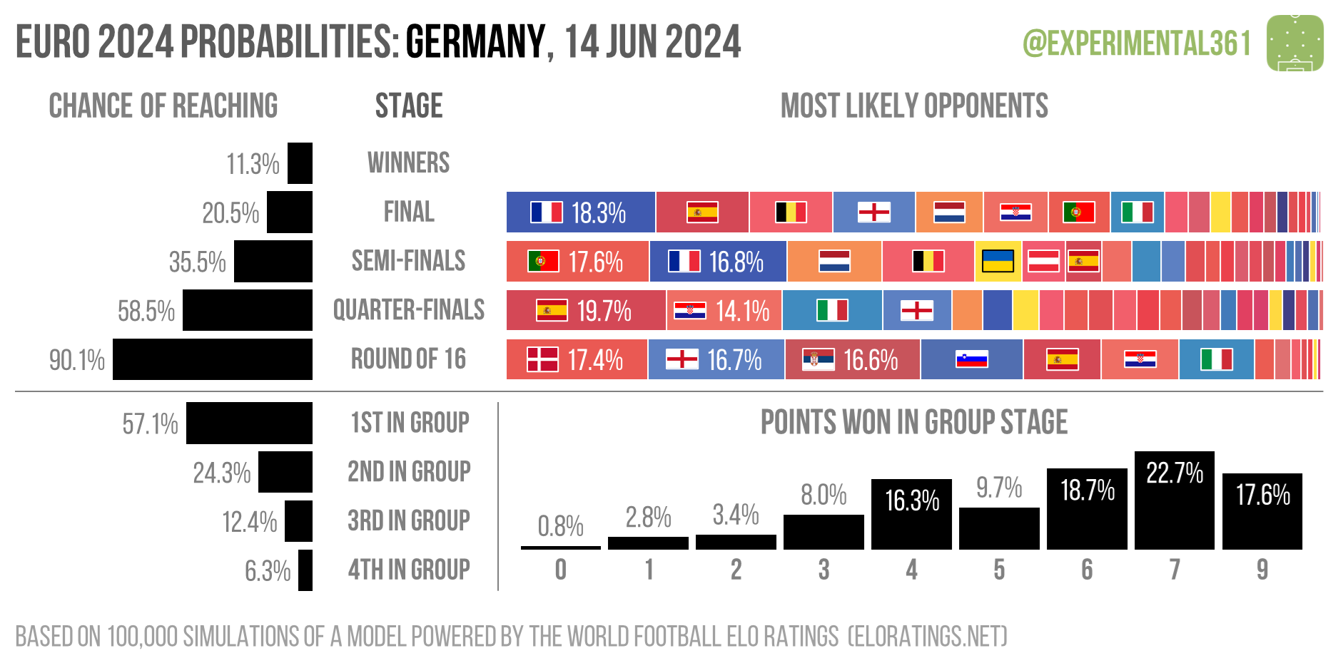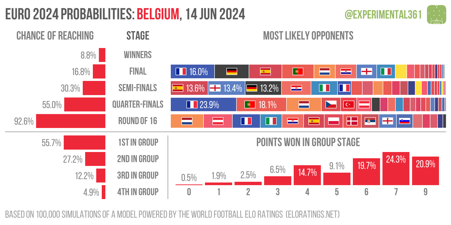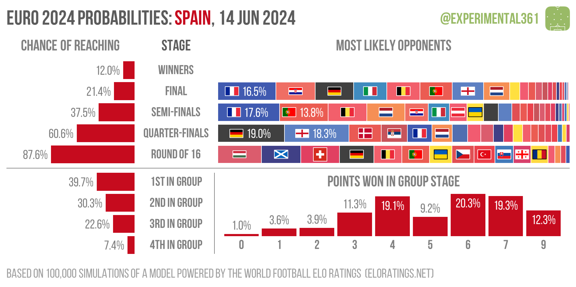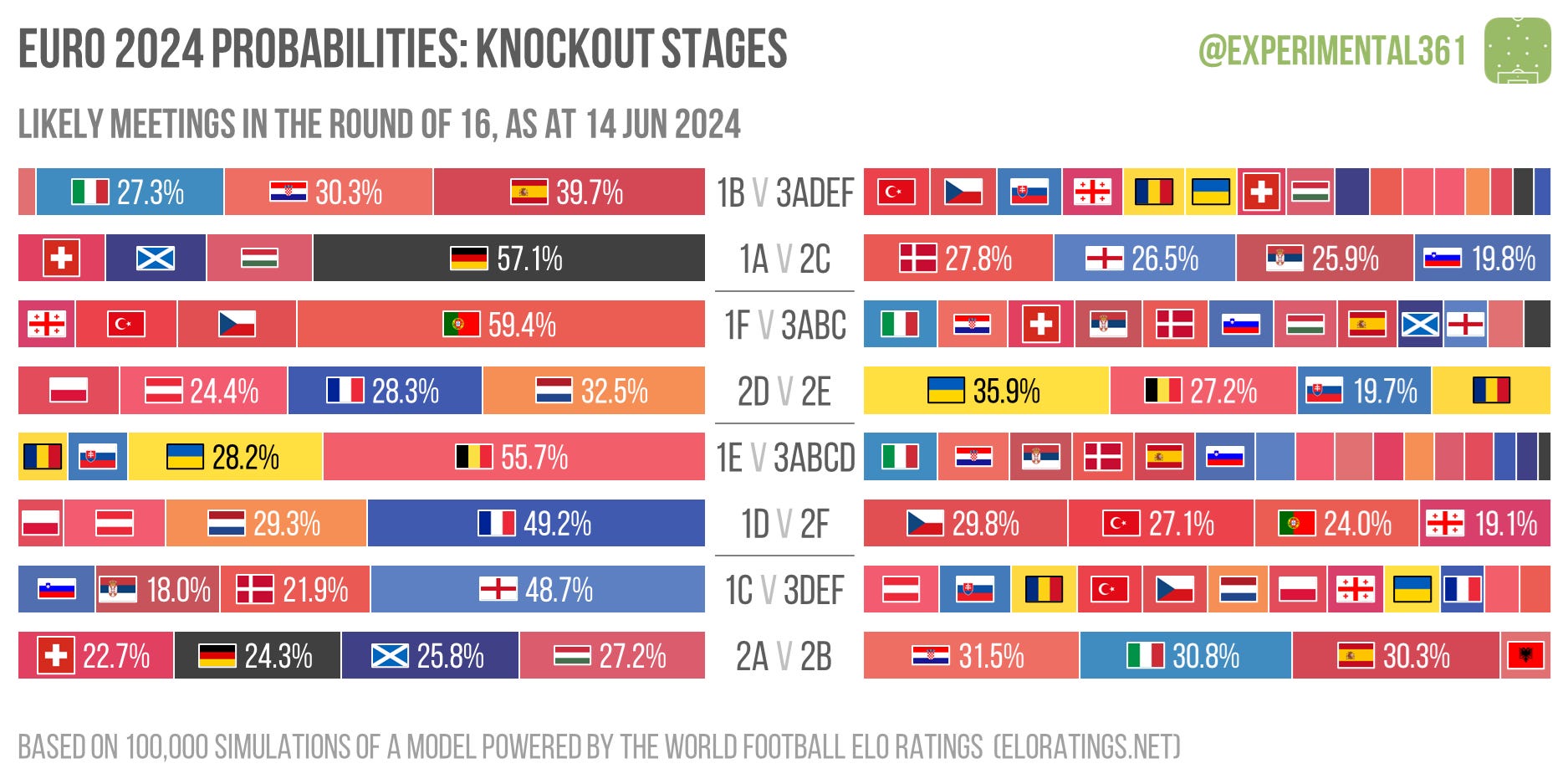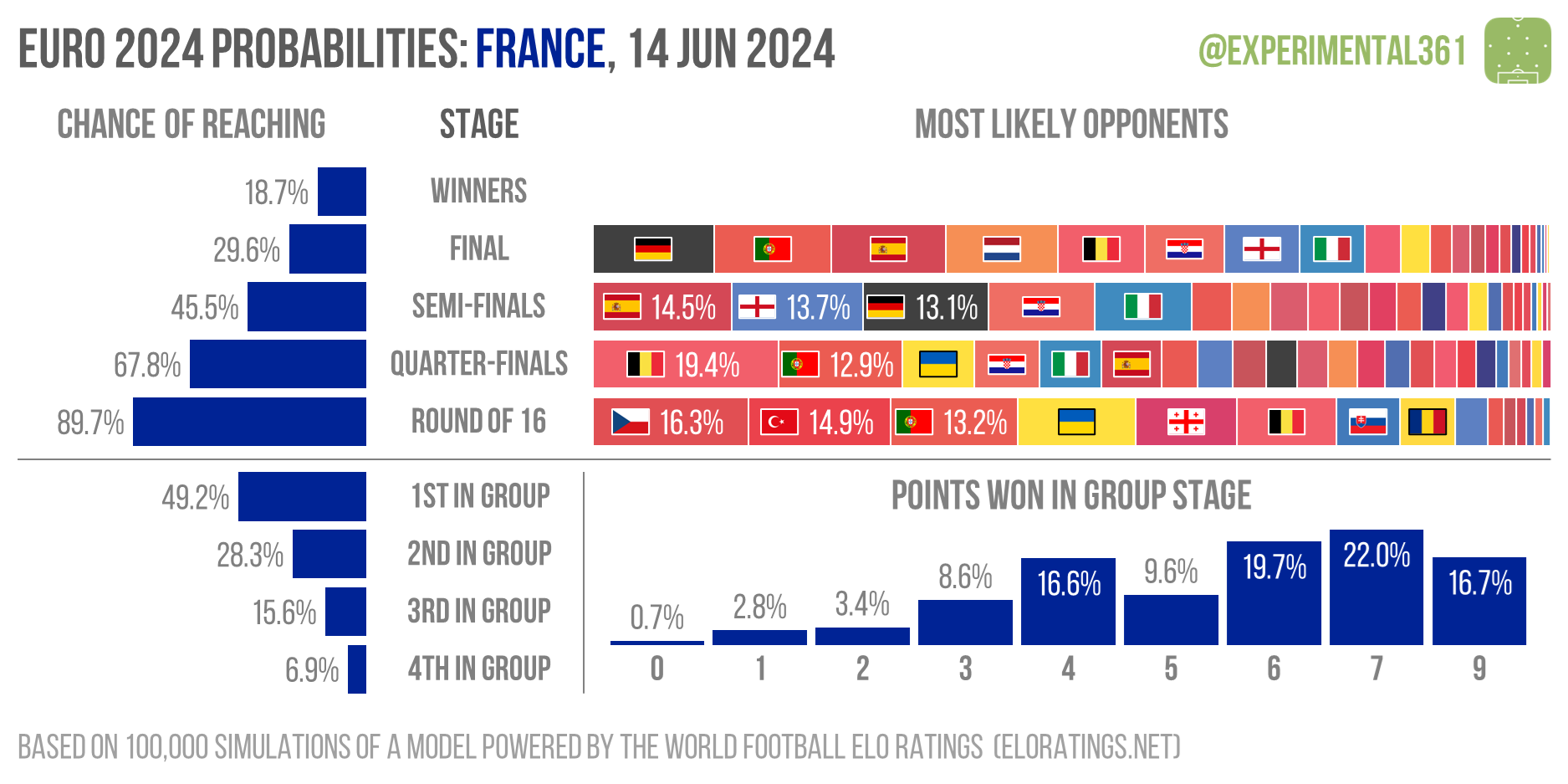 The French have the highest Elo rating of any UEFA team at present and are therefore the model’s pre-tournament favourites. They are aided further by having a relatively easy Round of 16 tie - assuming they top their group - against the runners-up from Group F.