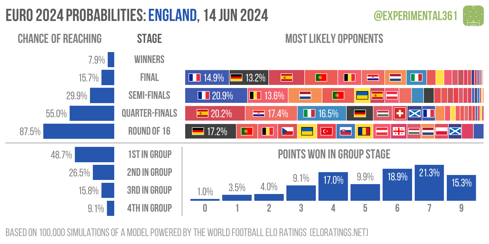 France and England are also likely to progress from their somewhat tougher groups, but have a less than 50% chance of doing so as winners.