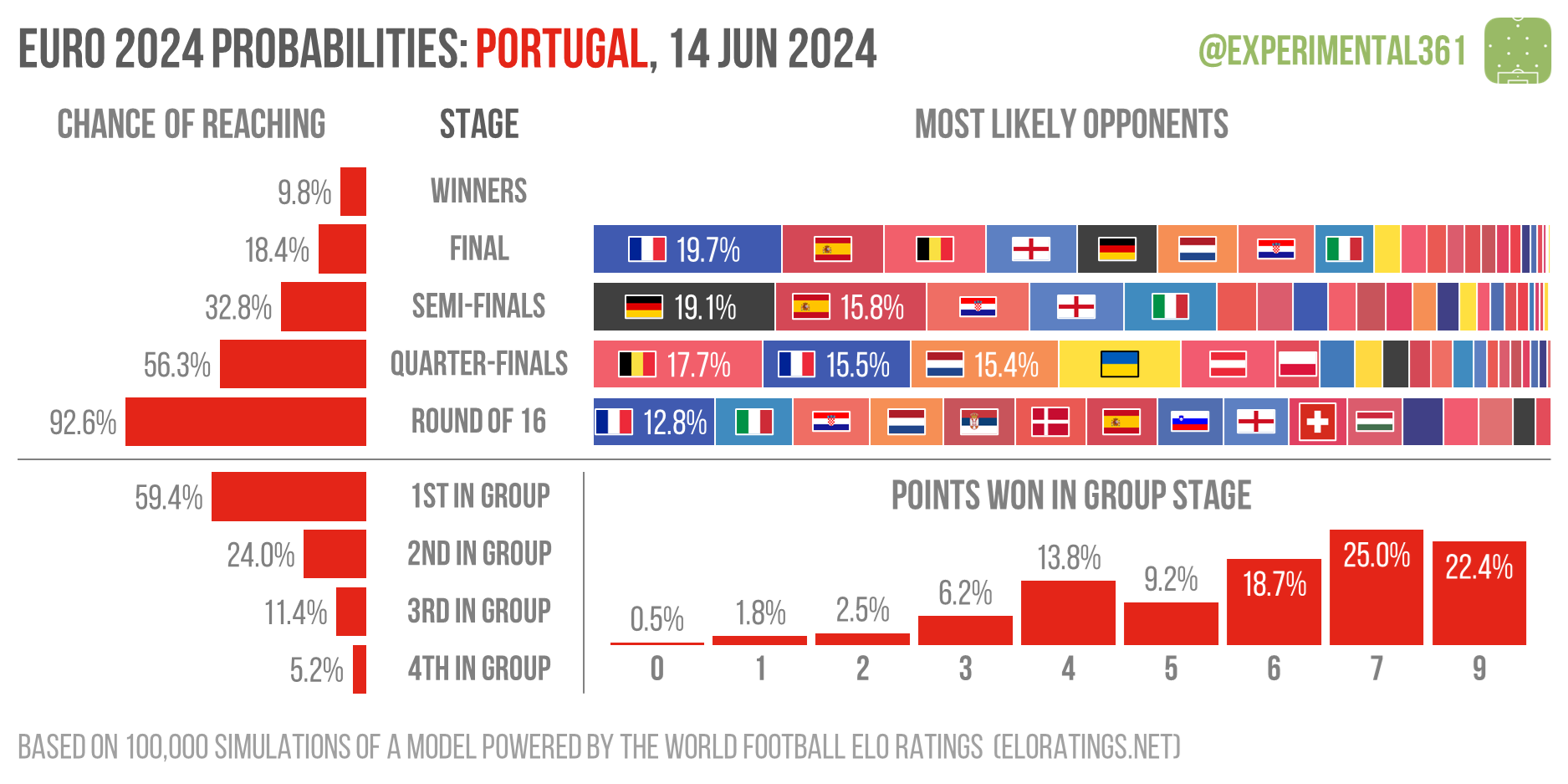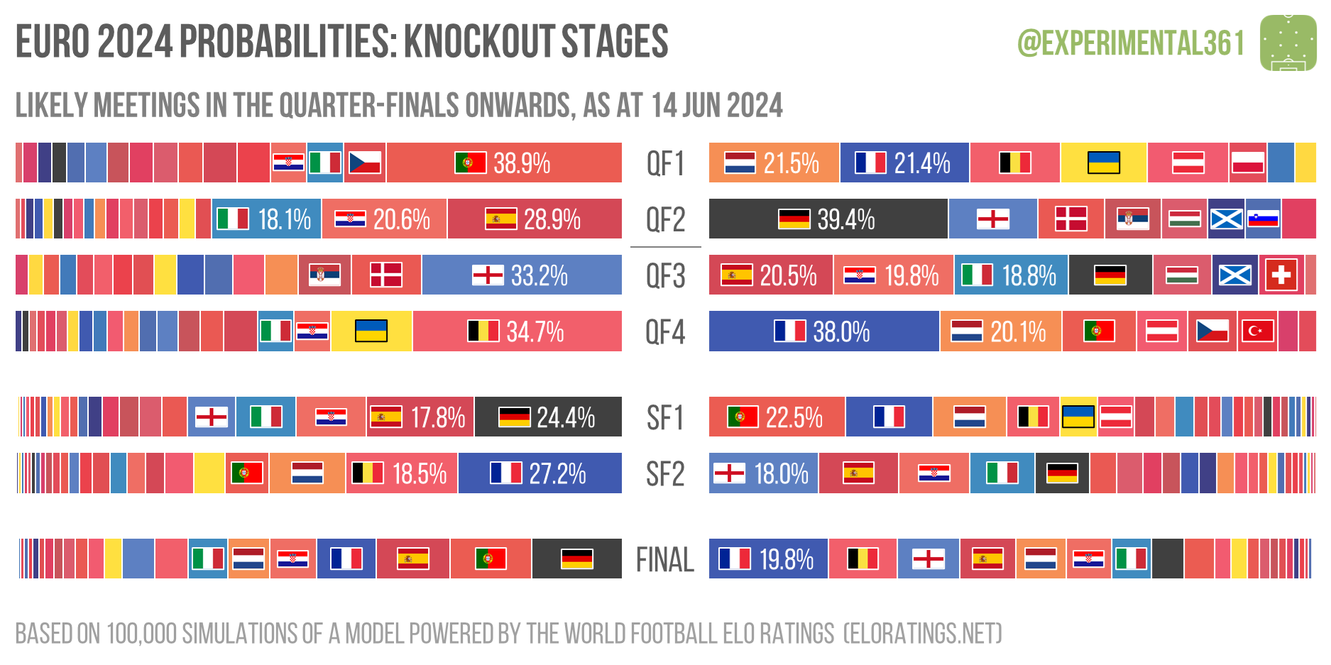 At the moment it looks like the most likely semi-finals are Germany versus Portugal and France versus England, but the margins are sufficiently fine that I expect this to have changed when I revisit this after the first round of group games is completed.